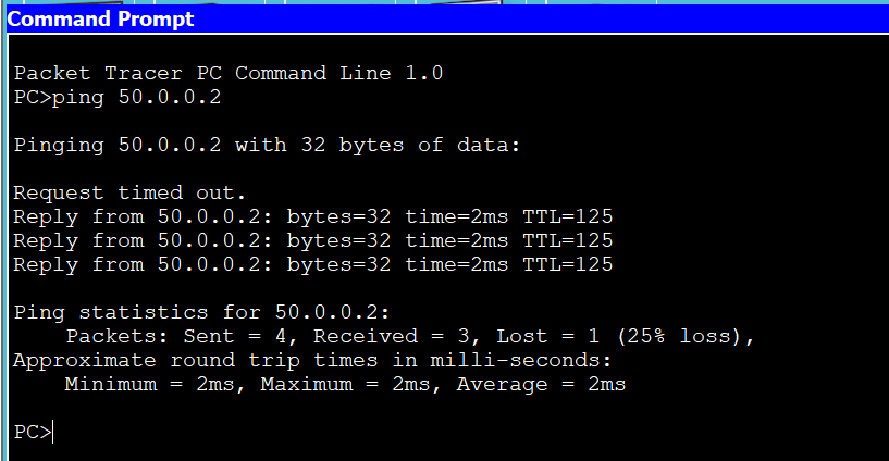 | Router>enable Router#configure terminal Router(config)#hostname R2 R2(config)#interface fastEthernet 0/0 R2(config-if)#ip address 50.32.0.1 255.248.0.0 R2(config-if)#no shutdown R2(config-if)#exit R2(config)#interface serial 0/1/0 R2(config-if)#ip address 50.42.0.2 255.255.255.252 R2(config-if)#no shutdown R2(config-if)#exit R2(config)#interface serial 0/0/0 R2(config-if)#ip address 50.42.0.5 255.255.255.252 R2(config-if)#clock rate 64000 R2(config-if)#no shutdown R2(config-if)#exit R2(config)#exit R2#write |