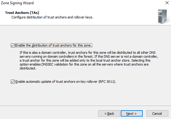 On the Trust Anchors (TAs) interface, check the Enable the distribution of trust anchors for this zone check box and then click Next.
