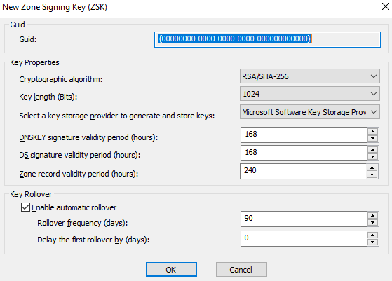 On the New Zone Signing Key (ZSK) interface, keep all settings as default and click Ok.